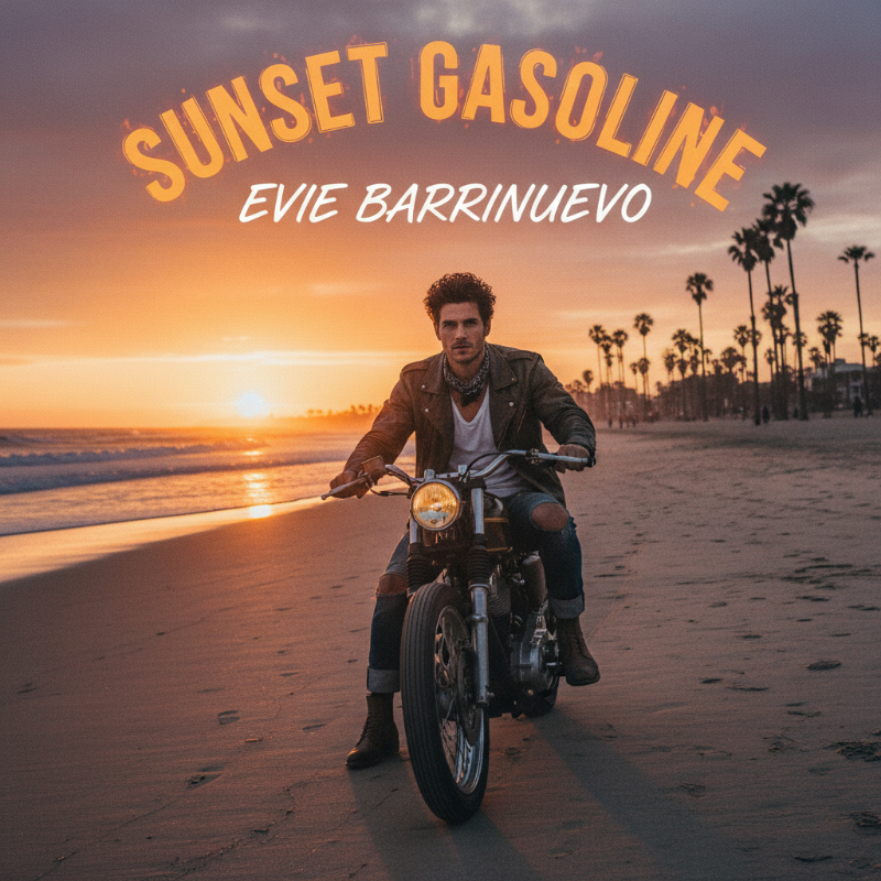 Sunset Gasoline is a downloadable song that features a handsome man riding a motorcycle on a sunset beach in California while listening to upbeat hard rock music.